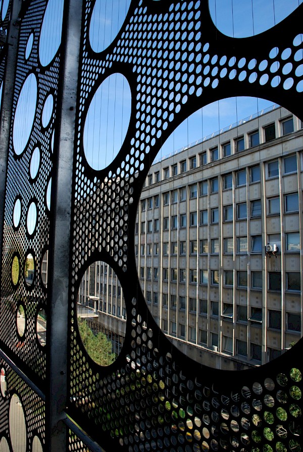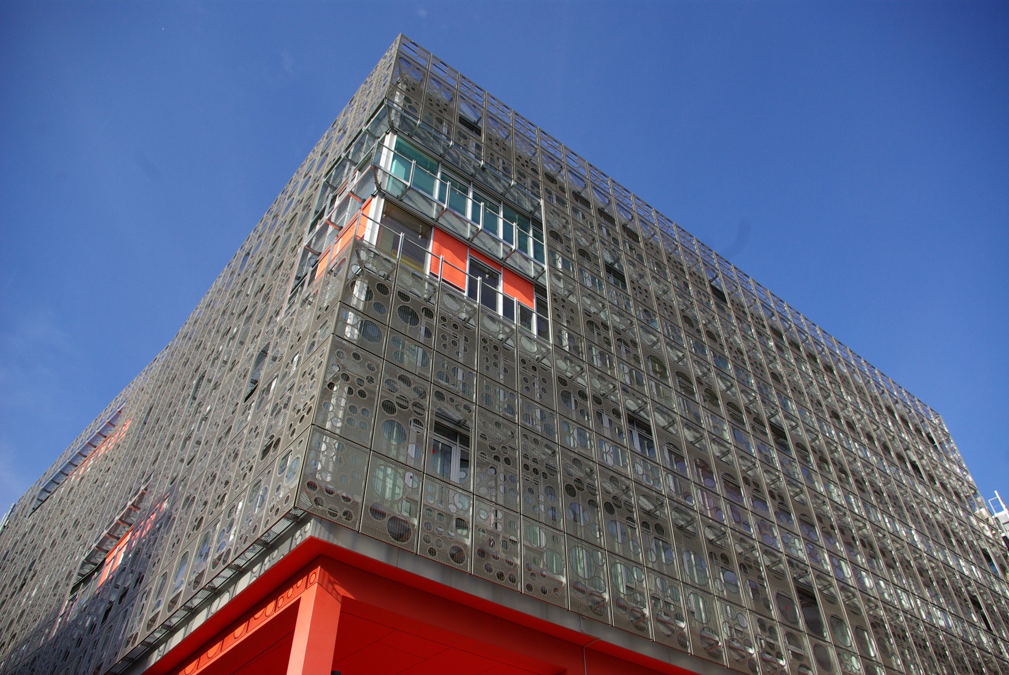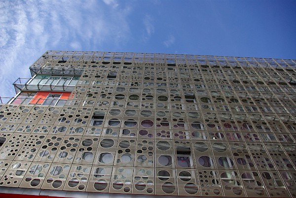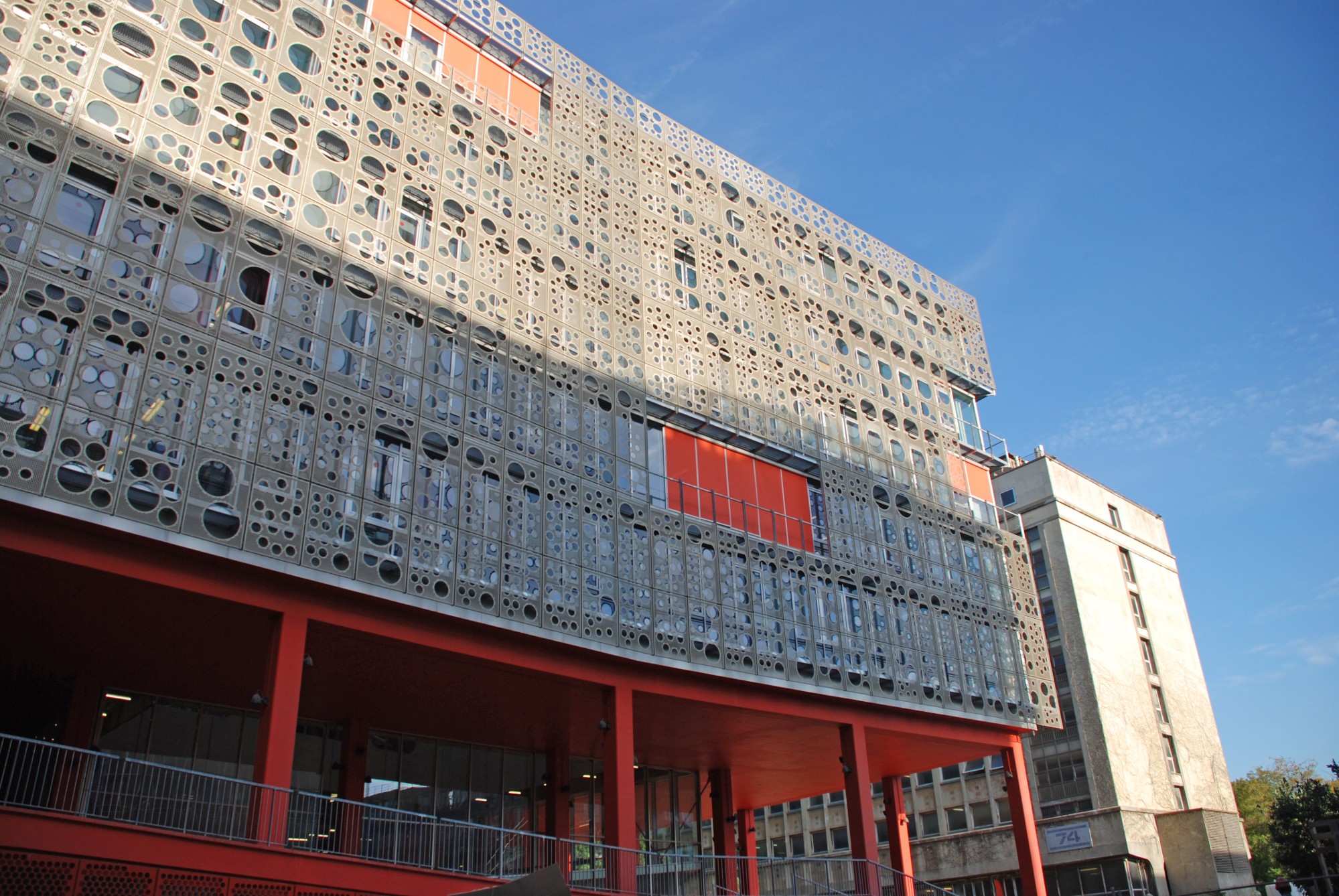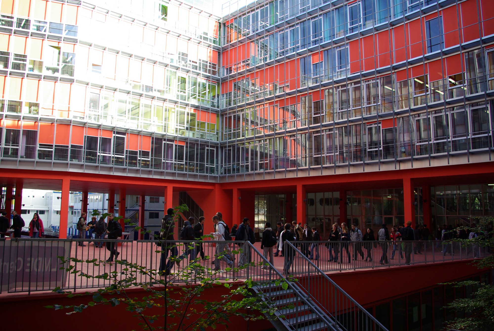 Derrière sa façade ajourée et dématérialisée, se développe dans toute la hauteur du bâtiment un gigantesque atrium central qui va organiser et distribuer les espaces intérieurs favorisant ainsi la gestion des flux importants d’étudiants.