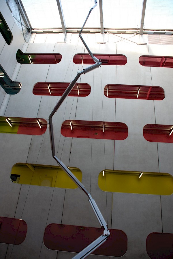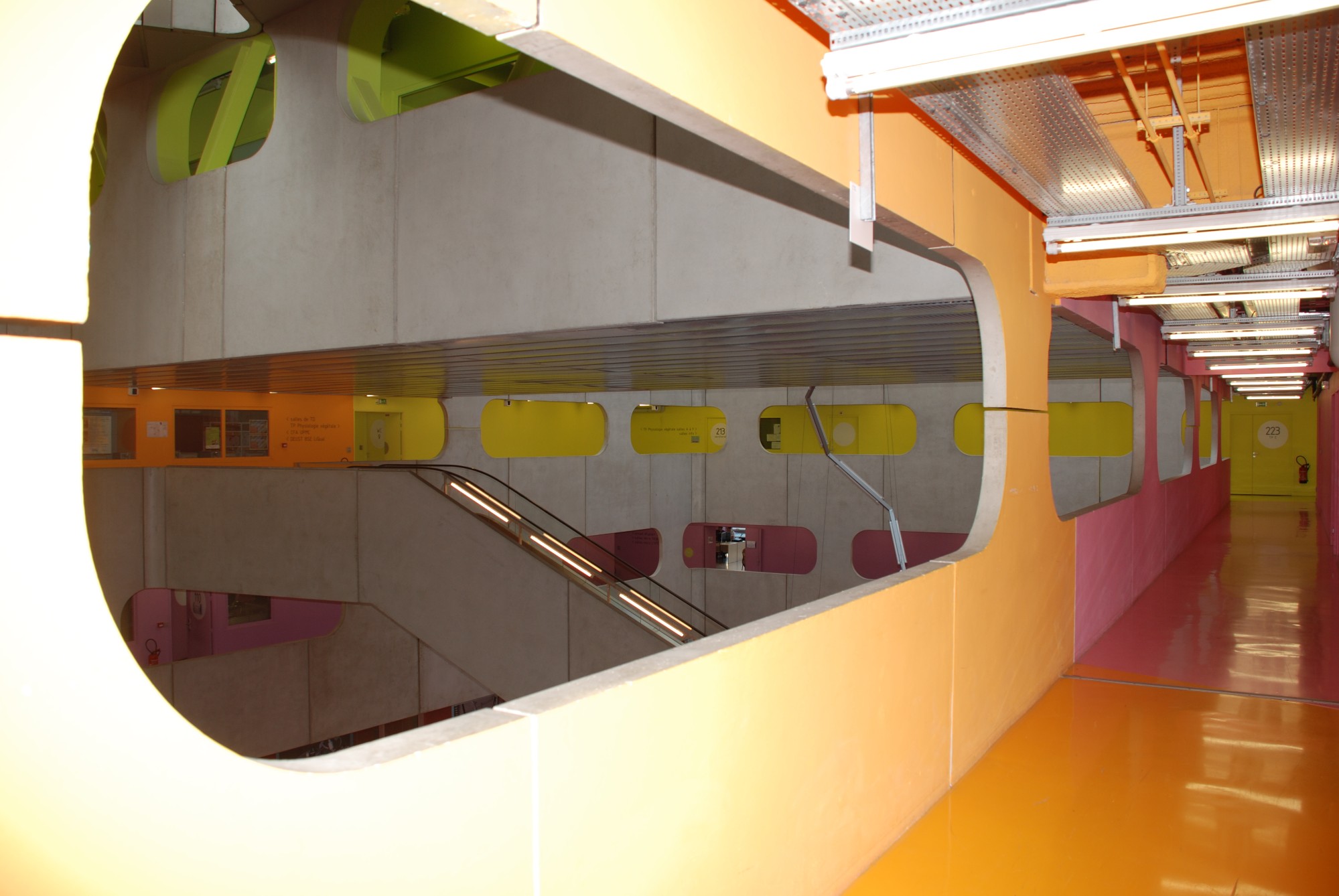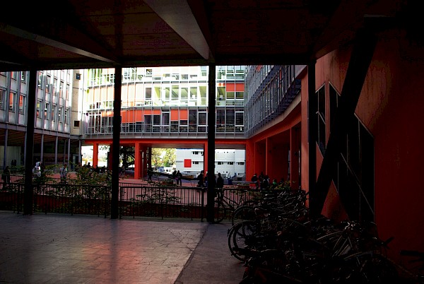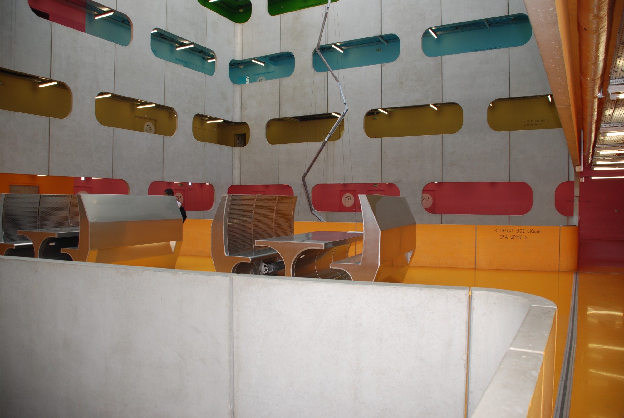 Le parti pris d'organisation de ce pôle pédagogique autour d'un grand vide central, qui constituait une véritable place verticale, propose aux utilisateurs une vision globale pour s'orienter et visualiser les différents secteurs d'enseignements. Elle est renforcée par une colorimétrie correspondant aux divers lieux d'enseignement : en un coup d'oeil, on est à même de savoir où se déroulera le prochain cours...